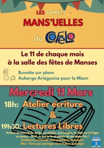 Le Comité des Fêtes et de Loisirs (COFELO) vous propose au mois de mars dans le cadre des “Soirées MANS’UELLES” un Atelier écriture à 18h et à 19h30 des lectures libres.