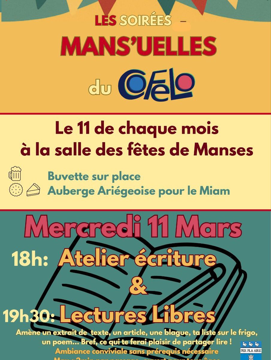 Le Comité des Fêtes et de Loisirs (COFELO) vous propose au mois de mars dans le cadre des “Soirées MANS’UELLES” un Atelier écriture à 18h et à 19h30 des lectures libres.